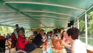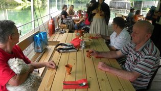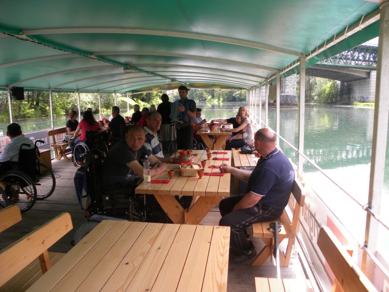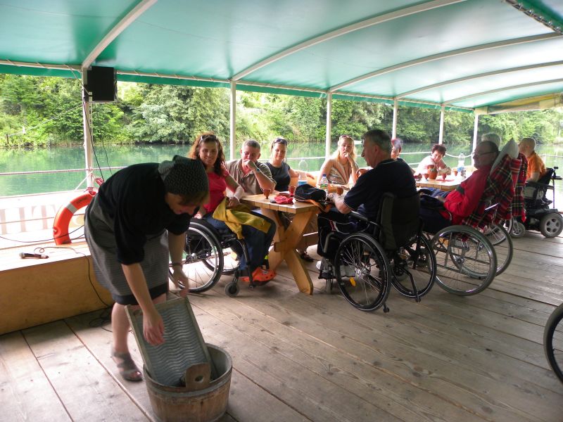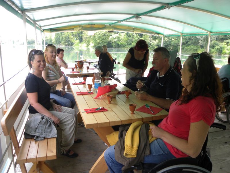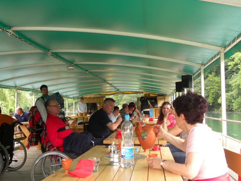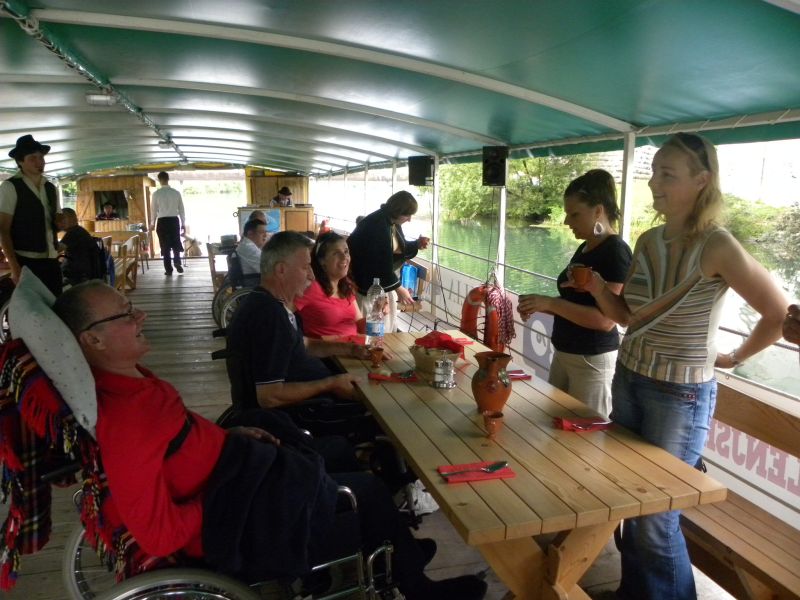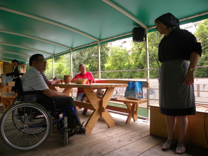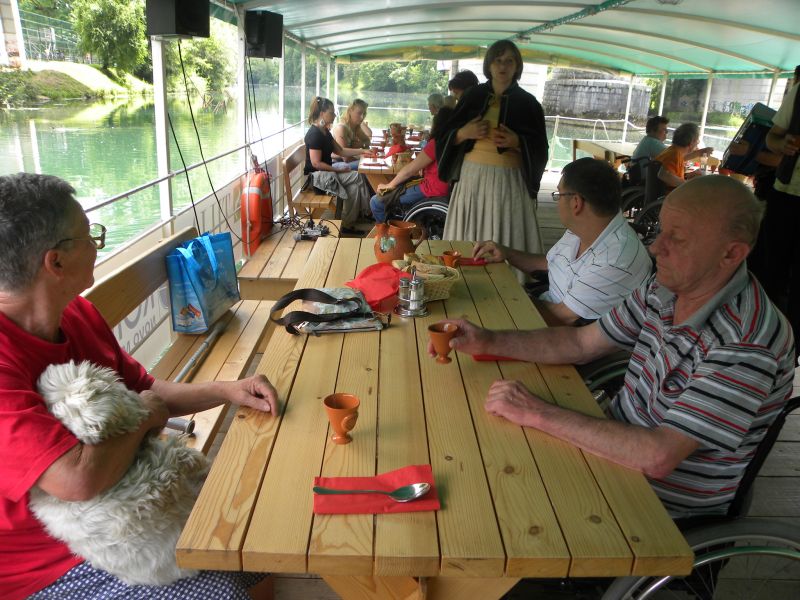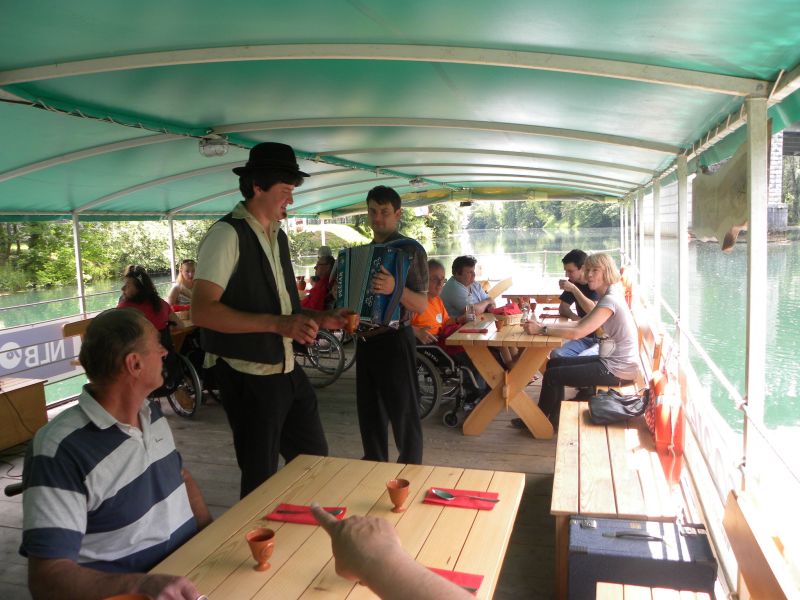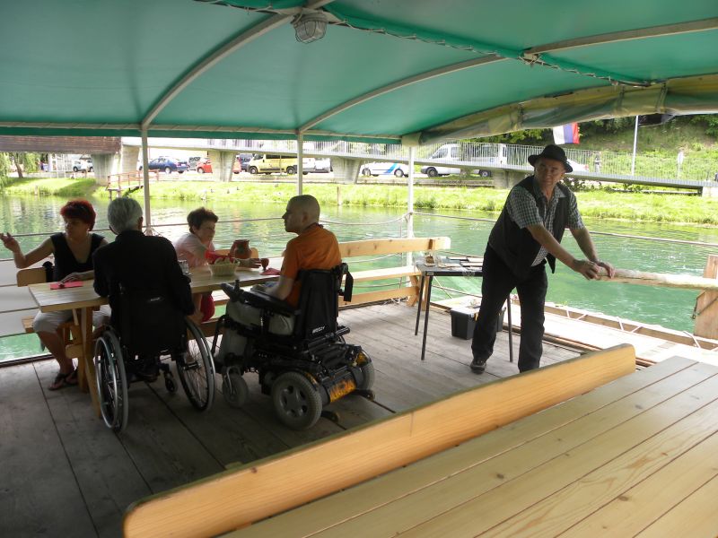 Po dnevu »počitka«, ki je minil ob klepetanju članov in z obiskom strokovne sodelavke Irene Lavrič, so se v četrtek odpravili še na splavarjenje po reki Krki. Pridružili sta se jim še podpredsednica društva Mirjam Kanalec in Mojca Burger. Rudolfov splav s Primičevo Julijo jih je ob spremljavi ansambla Andreja Bajuka popeljal po reki. Ob prijetnih zvokih, pogostitvi in čašo cvička jim je čas kar prehitro minil.