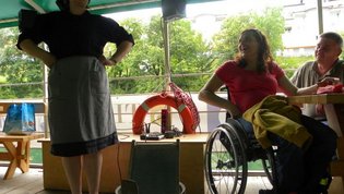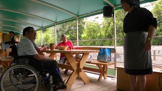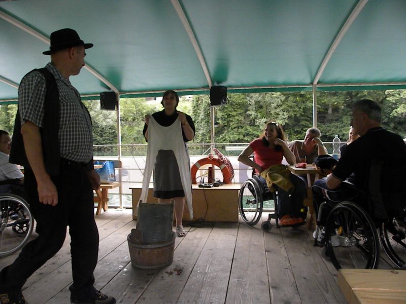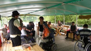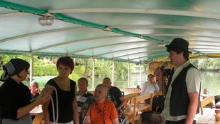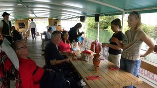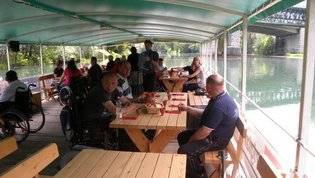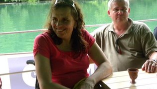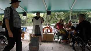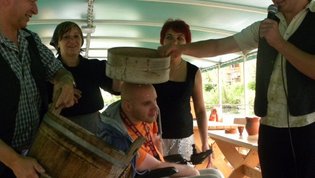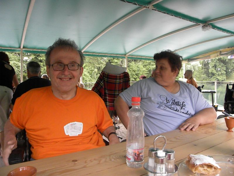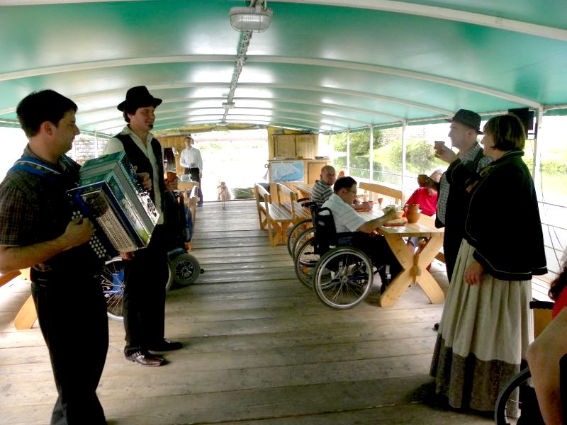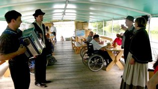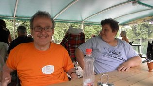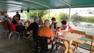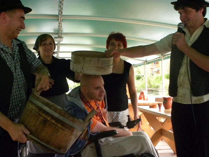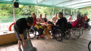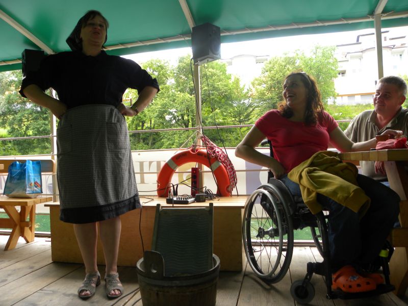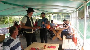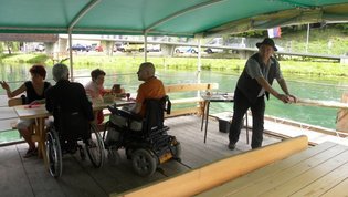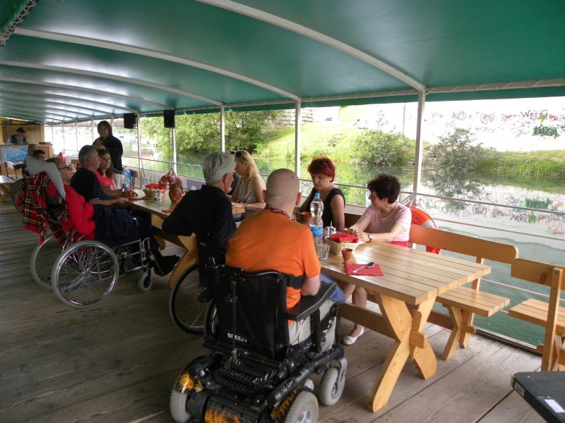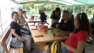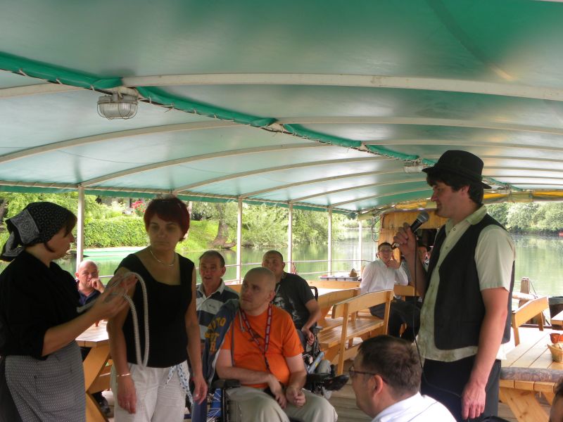 Po dnevu »počitka«, ki je minil ob klepetanju članov in z obiskom strokovne sodelavke Irene Lavrič, so se v četrtek odpravili še na splavarjenje po reki Krki. Pridružili sta se jim še podpredsednica društva Mirjam Kanalec in Mojca Burger. Rudolfov splav s Primičevo Julijo jih je ob spremljavi ansambla Andreja Bajuka popeljal po reki. Ob prijetnih zvokih, pogostitvi in čašo cvička jim je čas kar prehitro minil.