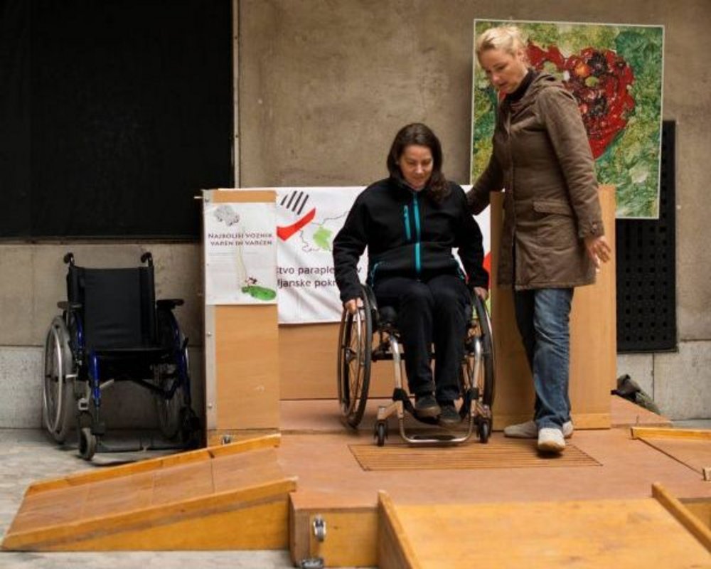 Predstavljene so bile tudi potrebe po odpravi fizičnih ovir v prostoru. Paraplegiki smo opozarjali na ovire, s katerimi se srečujemo v grajenem okolju. Obiskovalci so v atriju Magistrata lahko z invalidskim vozičkom preizkusili, kaj v praksi pomenijo nepravilen naklon klančine, preširoke reže, preozka vrata in podobne ovire. V spremstvu predstavnikov Društva paraplegikov ljubljanske pokrajine so ob zaključku dogodka z vozičkom odšli na kavo v bližnji lokal.