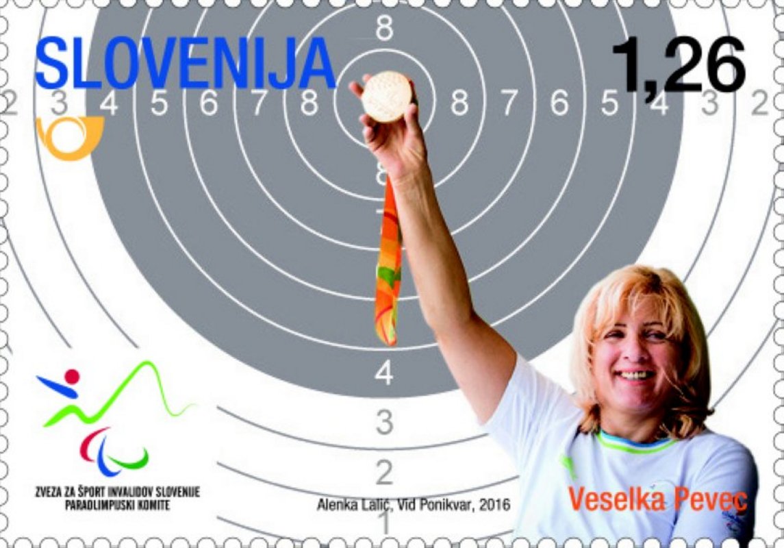 To je še en korak do izenačitve invalidnih in neinvalidnih športnikov, za katerega se je odločila Komisija za izdajo poštnih vrednotnic. Ta izjemna čast je pripadla zlati strelki našega društva Veselki Pevec, znamka z njenim motivom pa je izšla 7. decembra 2016. S priložnostnimi znamkami je Pošta Slovenije do sedaj počastila vse zlate prejemnike olimpijskih medalj, osvojene za samostojno Slovenijo.
