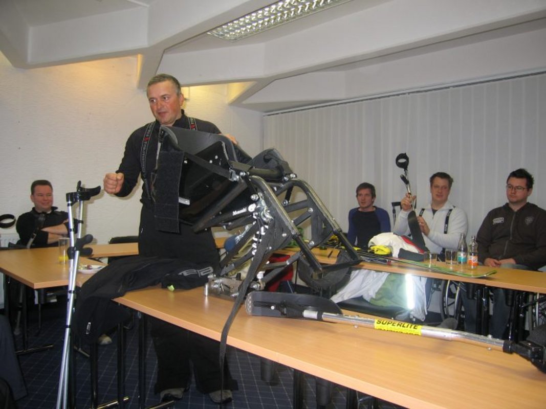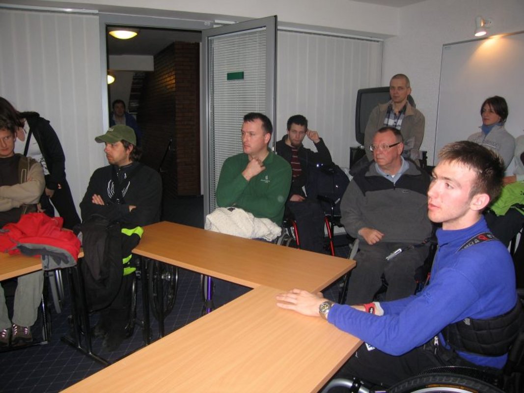Ker so bili smučarji v Kranjski Gori že zbrani, so izkoristili priložnost in odpoved izkoristili za kratko srečanje. V hotelu Larix je trener smučarske reprezentance Bojan Kavčič predstavil načrtovan potek smučarskega dne, reprezentant Gal Jakič tekmovanje in monoski smučko, referent za šport pri ZPS in naš predsednik Gregor Gračner pa namen in cilje smučanja paraplegikov.