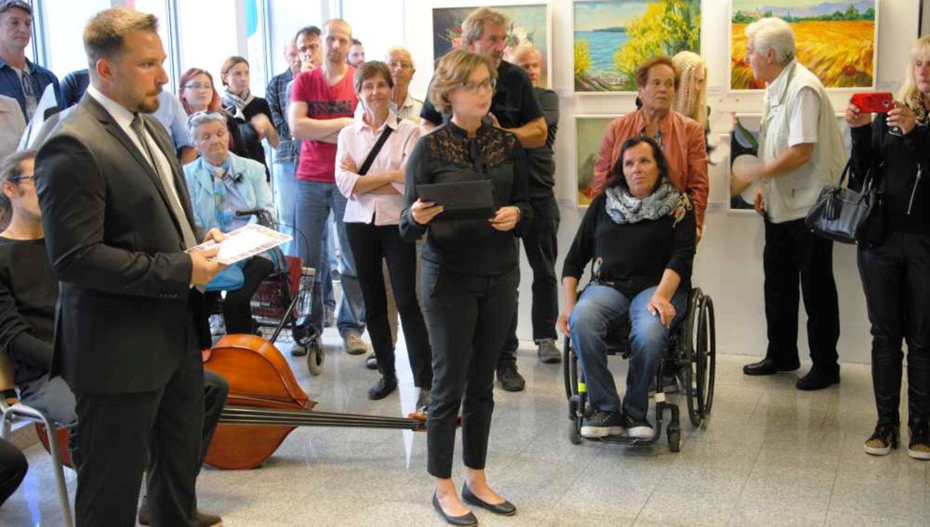 Številne ljubitelje likovne umetnosti je nagovorila državna sekretarka Ministrstva za kulturo mag. Petra Culetto in odprla razstavo. Ob tej priložnosti ji je naš slikar Benjamin Žnidaršič izročil svojo sliko.