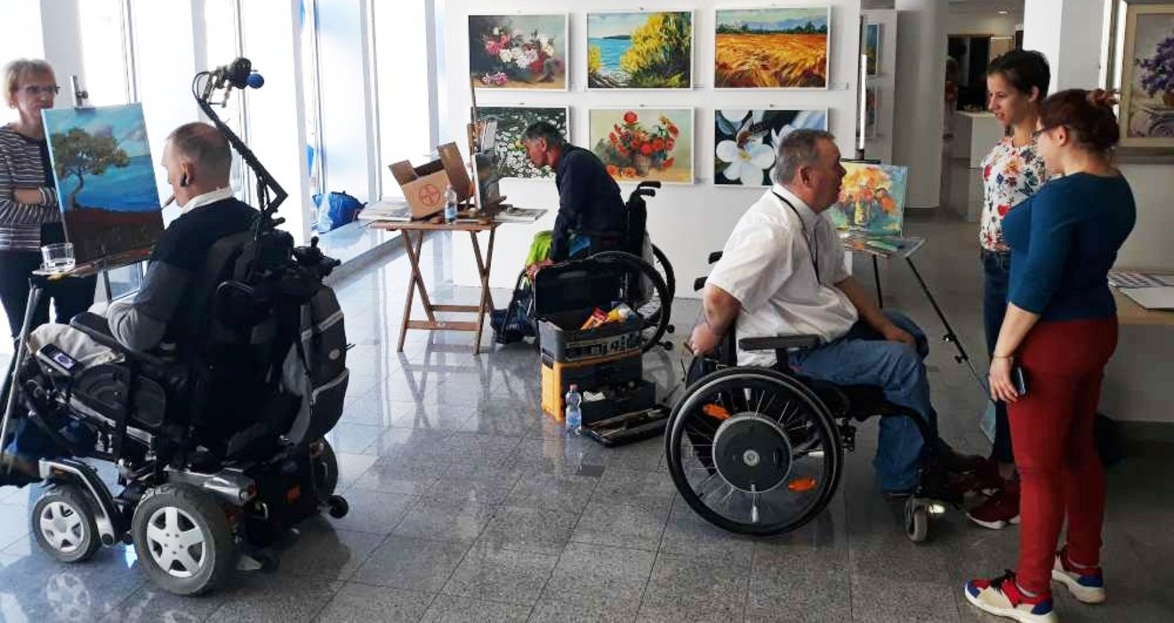 Vojko Gašperut, Benjamin Žnidaršič, (polnopravna člana združenja), Dragica Sušanj, Tina Pavlovič, Nevenka Gorjanc Željko Vertelj, Gregor Janežič in Roman Gruntar slikajo z usti, Neja Zrimšek-Žiger, Eric Pibernik, Dejana Bačko (Srbija) in Stjepan Perković (Hrvaška) pa svoja dela ustvarjajo z nogami.