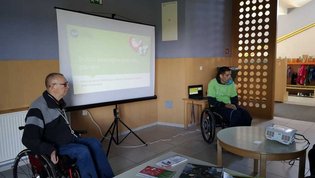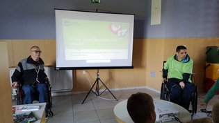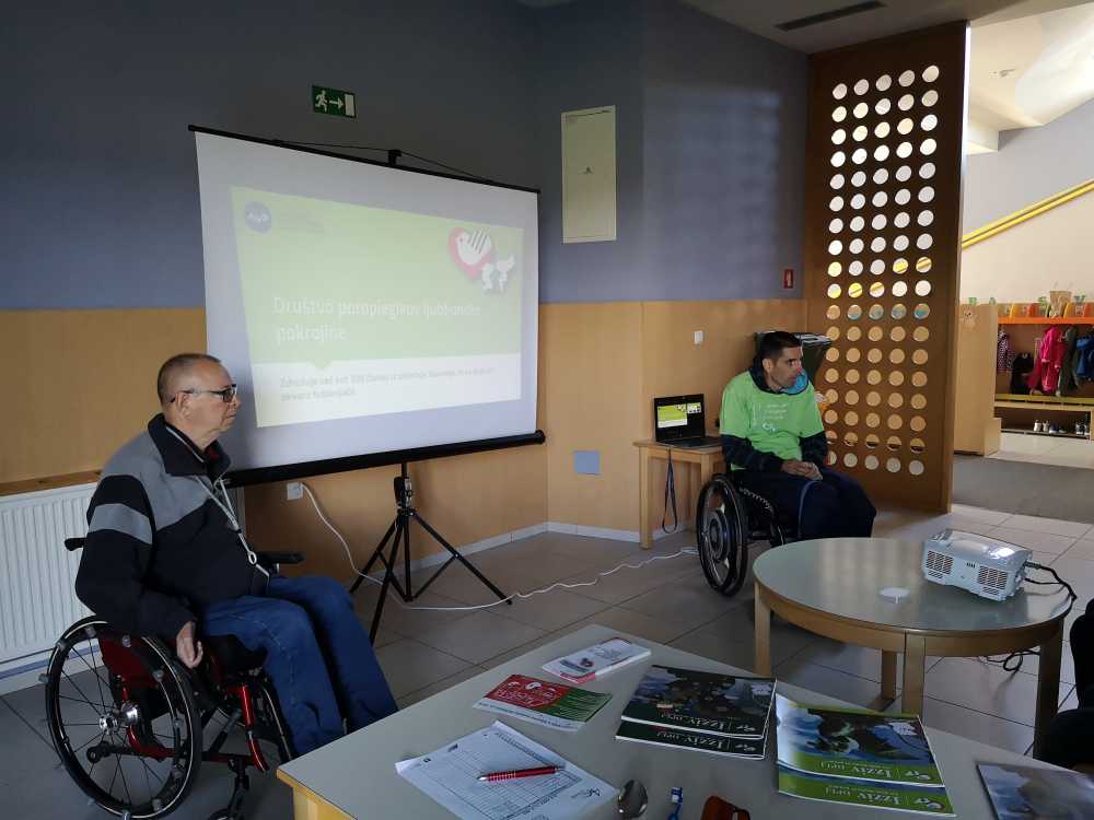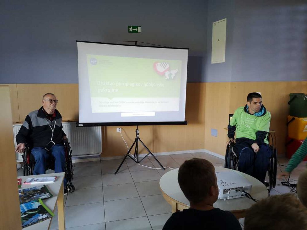 Na prvi delavnici sta Rok in Jože s projekcijo fotografij predstavila kompleksno dejavnost društva in vzroke, ki so botrovali naši invalidnosti. Učenci so še posebej z velikim zanimanjem prisluhnili Rokovi in Jožetovi zgodbi, ki sta ju pripeljali na invalidski voziček.