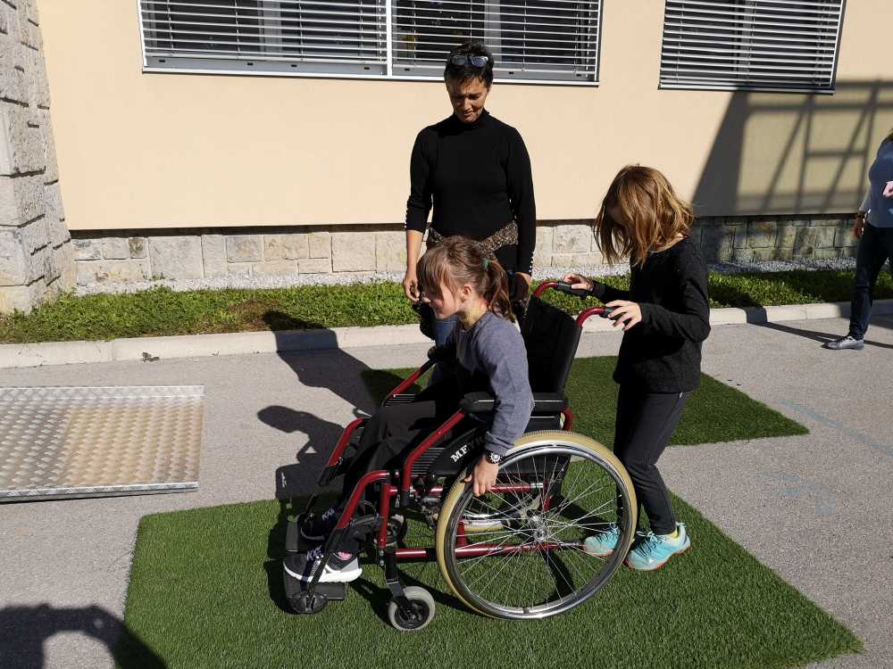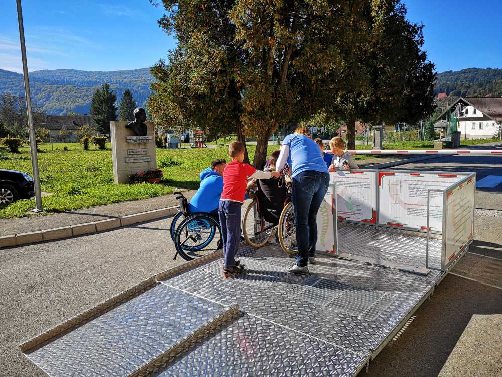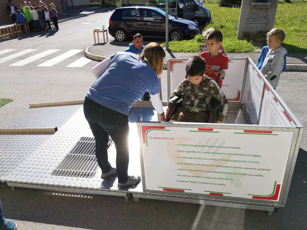 Na drugi delavnici so na poligonu z različnimi klančinami in drugimi preprekami praktično preskusili s kakšnimi arhitekturnimi ovirami še vedno srečujemo, z vožnjo po umetni travi pa so spoznali kako težko je poganjati voziček po neravnem terenu. Napotke jim je dajal Lutfi, za varnost pa sta poskrbeli še Mateja in Alena.