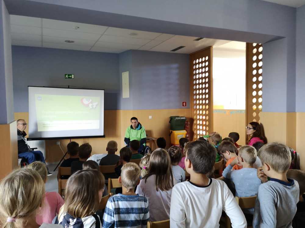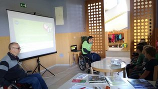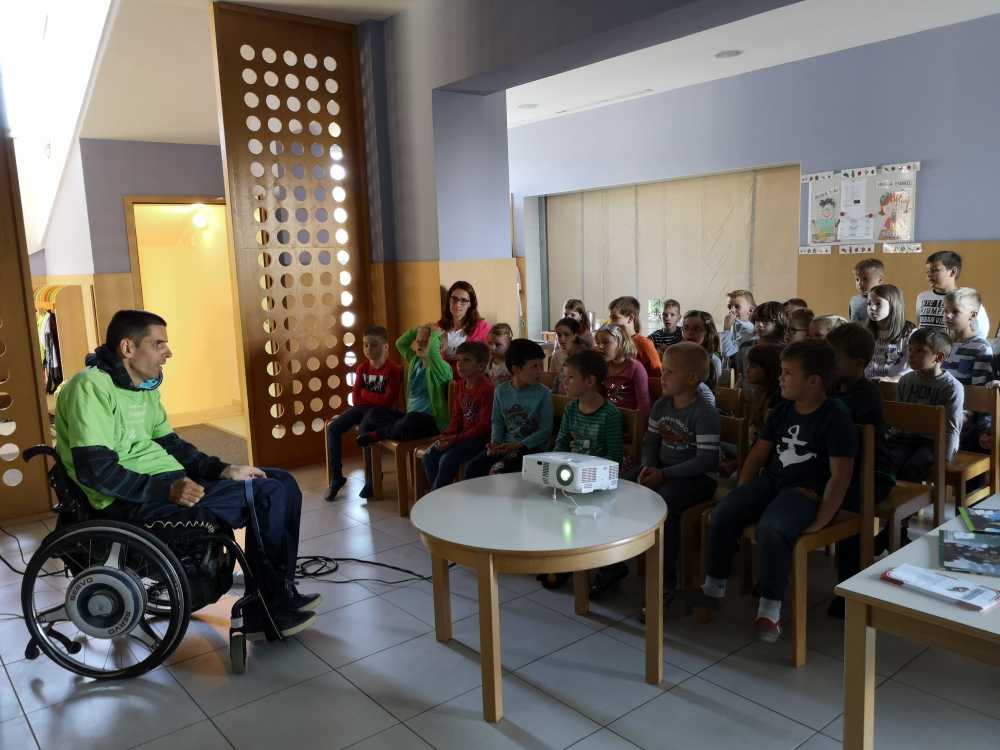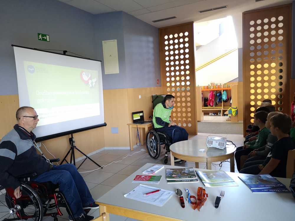 Na prvi delavnici sta Rok in Jože s projekcijo fotografij predstavila kompleksno dejavnost društva in vzroke, ki so botrovali naši invalidnosti. Učenci so še posebej z velikim zanimanjem prisluhnili Rokovi in Jožetovi zgodbi, ki sta ju pripeljali na invalidski voziček.