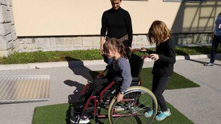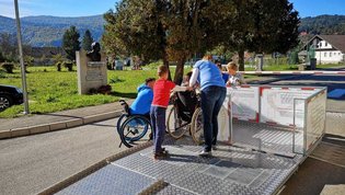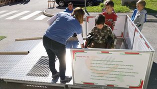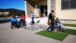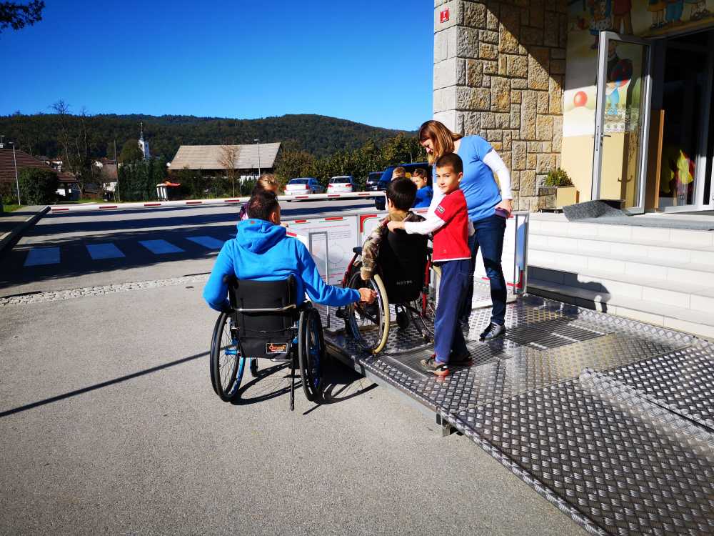 Na drugi delavnici so na poligonu z različnimi klančinami in drugimi preprekami praktično preskusili s kakšnimi arhitekturnimi ovirami še vedno srečujemo, z vožnjo po umetni travi pa so spoznali kako težko je poganjati voziček po neravnem terenu. Napotke jim je dajal Lutfi, za varnost pa sta poskrbeli še Mateja in Alena.