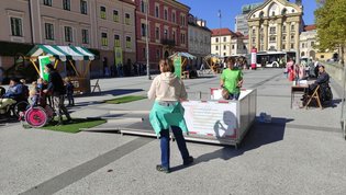 Na stojnici našega društva na Kongresnem trgu smo s publikacijami in drobnimi medicinskimi pripomočki ter osebnimi zgodbami predstavili celostno društveno dejavnost, na poligonu, ki ga sestavljajo različno strme klančine in neprimerna rešetka z vhodom v manjši prostor, pa so se obiskovalci z vožnjo z invalidskimi vozički lahko prepričali kakšne preglavice nam povzročajo arhitekturne ovire in kako jih premagujemo. Na umetni travi pa so videli kako težka je vožnja na takem terenu. Našo stojnico so med drugimi obiskali šolarji in pa seveda tudi ljubljanski župan Zoran Janković.