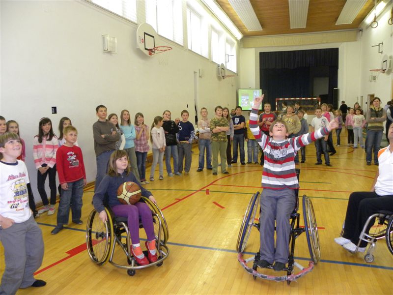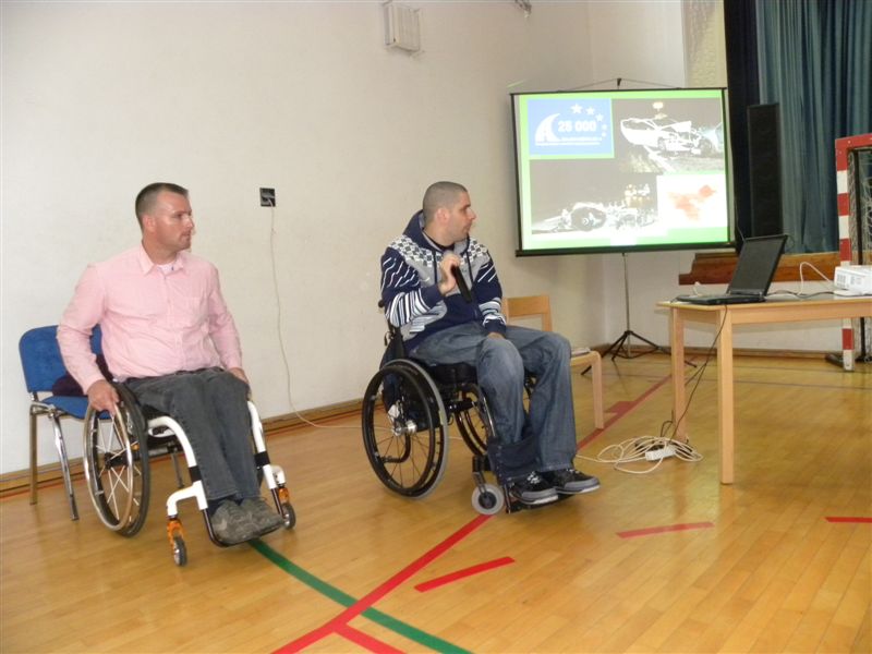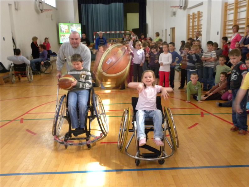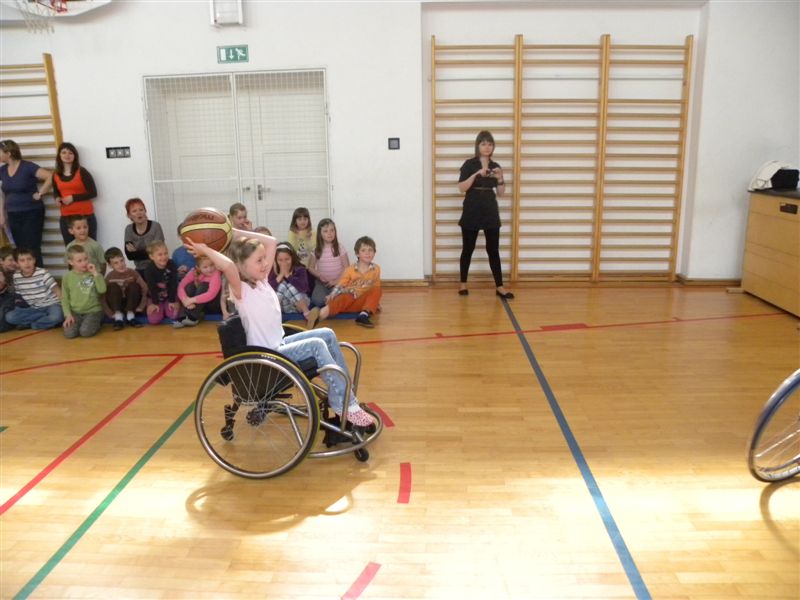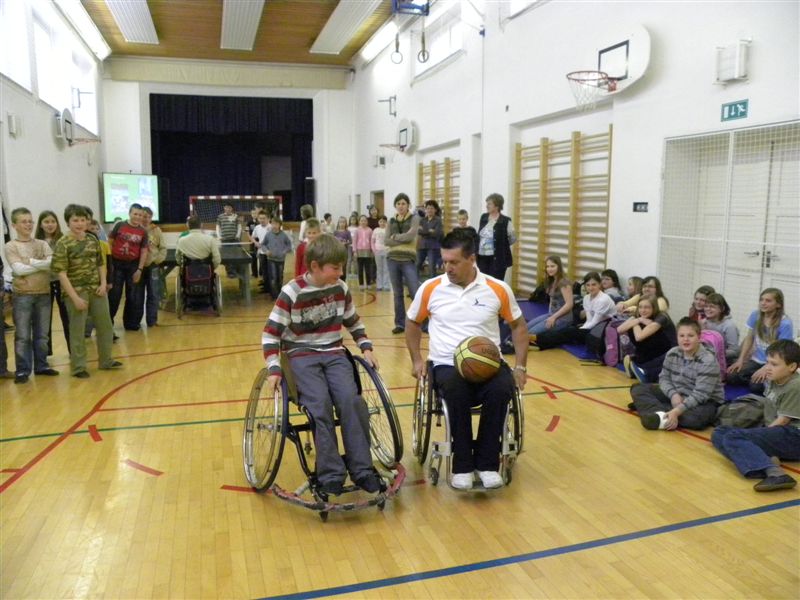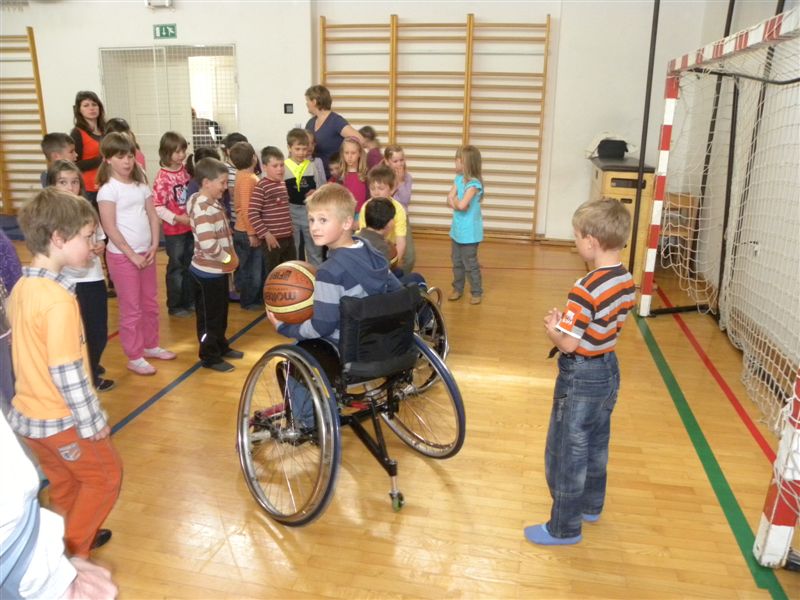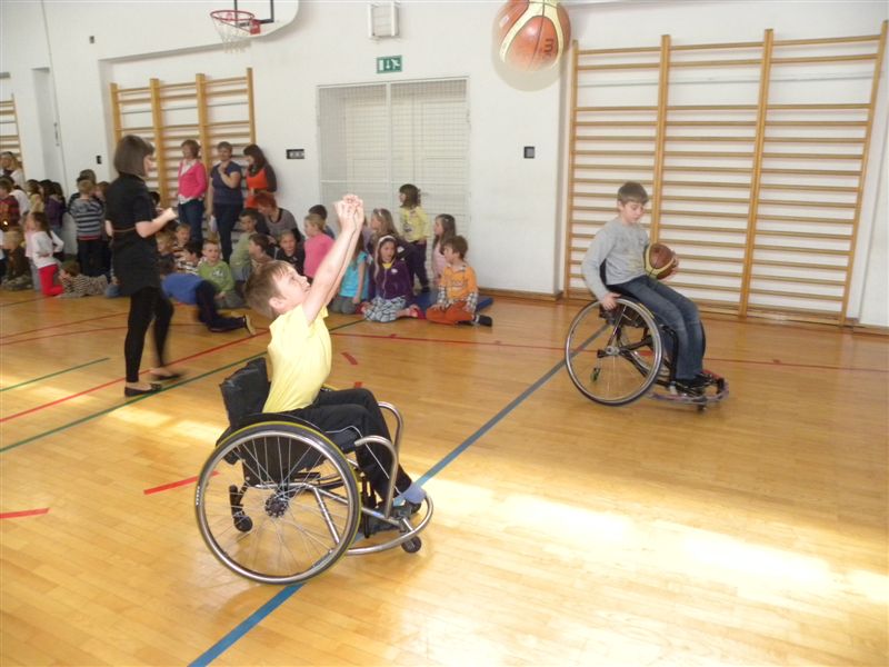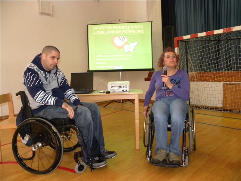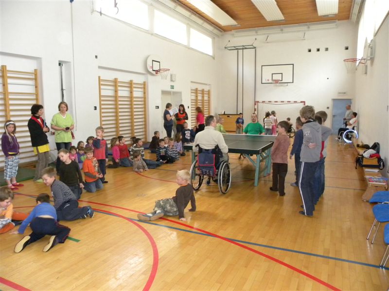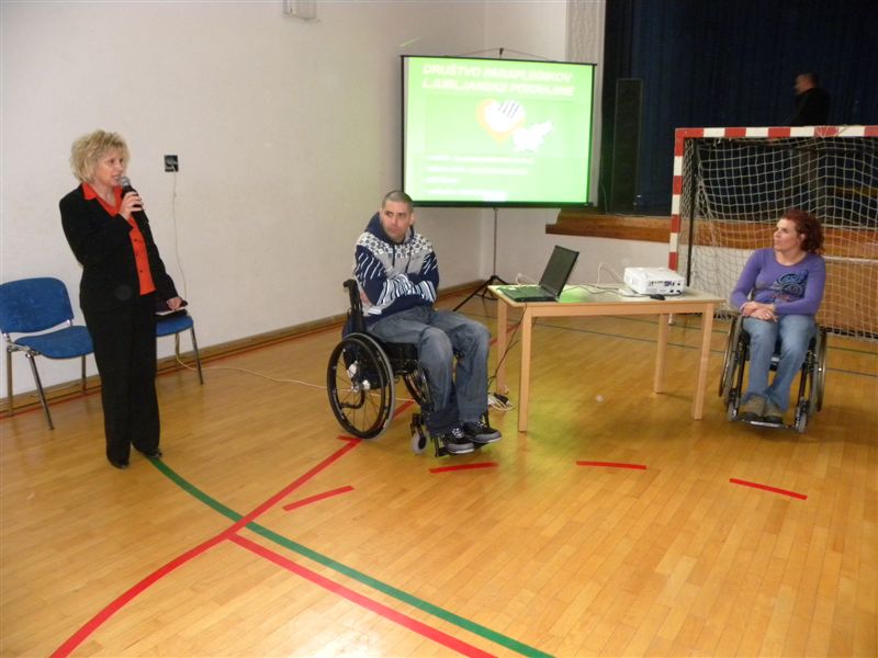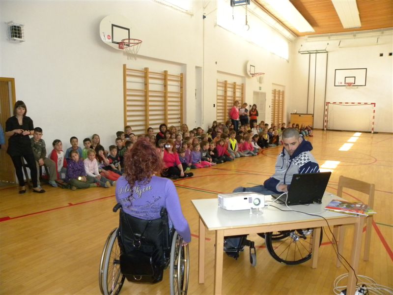 Tokratna predstavitev je potekala v treh delih. Najprej smo se predstavili malčkom v vrtcu, nato pa vsem učencem od prvega do devetega razreda. Pred vsako našo predstavitvijo nas je lepo pozdravila in napovedala ravnateljica prof. Majda Kovačič Cimperman, mi pa smo nato predstavili delovanje društva, življenje ljudi s poškodbo hrbtenjače in vzroke, ki pripeljejo do teh poškodb. Prav tem vzrokom smo dali največ poudarka, saj smo želeli preventivno opozoriti na številne nesreče zaradi katerih človek lahko pristane na invalidskem vozičku. Predstavitev smo slikovno podprli in prilagodili glede na starost slušateljev. Celotno dogajanje je potekalo v telovadnici šole, kjer so se predstavili tudi naši košarkarji in igralci v namiznem tenisu. Posebna predstavitev pa je bila tudi v avli šole, kjer so svoje ročne spretnosti pokazale naše članice in slikar Željko Vertelj, ki svoja umetniška dela ustvarja s čopičem v ustih.