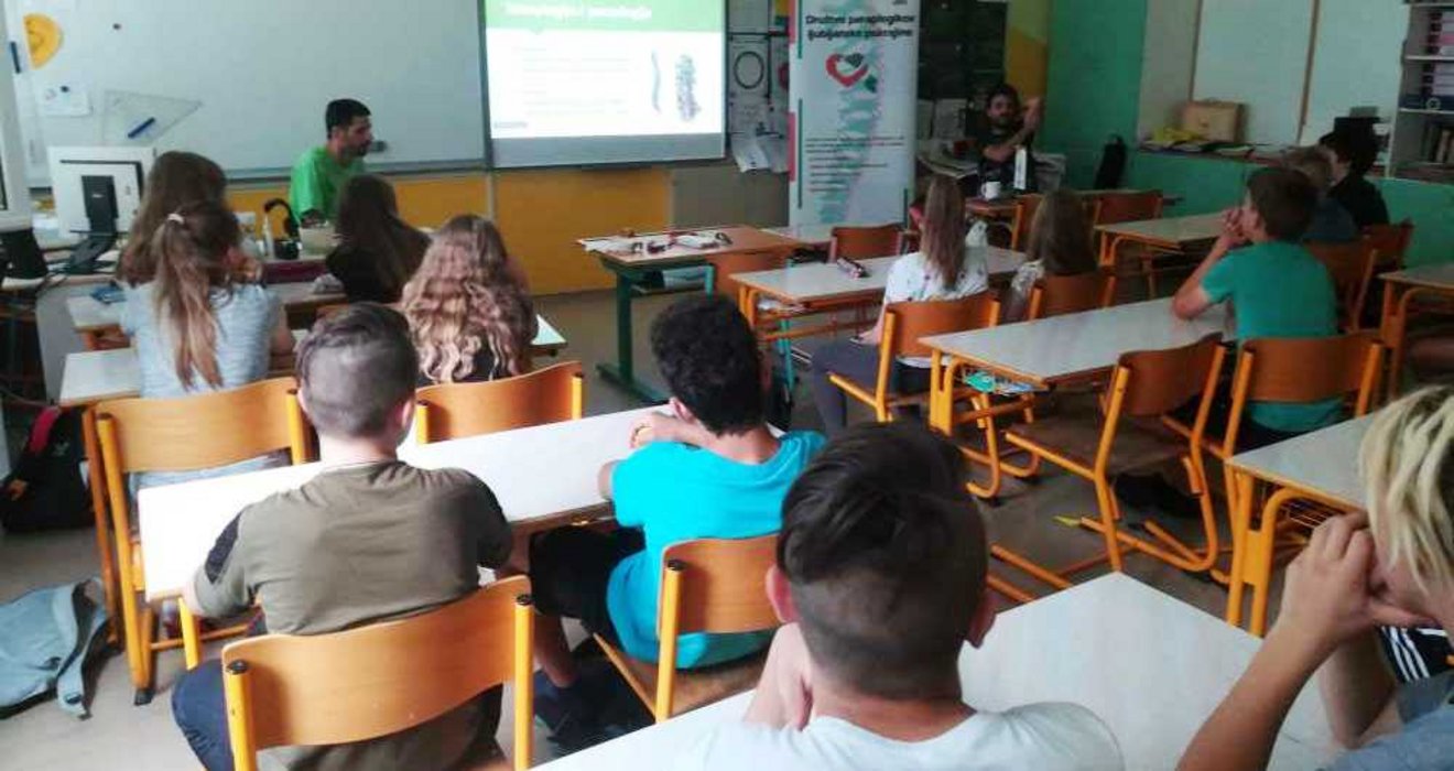 Z učiteljico etike Majo Grbec- Švajncer smo se dogovorili, da se tokrat predstavimo osmim razredom. Tako sta Nino in Rok v treh predavanjih učencem predstavila kaj so poškodbe hrbtenjače, kakšni so najpogostejši vzroki za njihov nastanek ter hude posledice, ki jih pusti tovrstna poškodba. Predstavila sta tudi svoji zgodbi. Rok se je poškodoval v prometni nesreči, Nino pa pri skoku na glavo v vodo. Prav prometne nesreče so najbolj pogost vzrok nastanka paraplegije in tetraplegije, saj predstavljajo kar 33 odstotkov vseh poškodb. Pri skokih v vodo se vedno zlomi hrbtenica v vratnem predelu, kar pripelje do tetraplegije, ki je zelo huda poškodba. Učence sta tako opozorila na pasti, ki prežijo na njih v prometu in skokih na glavo v vodo. Ker pa se življenje po poškodbi nadaljuje, sta jim predstavila tudi programe društva, ter s projekcijo fotografij pokazala s čim vse se paraplegiki in tetraplegiki ukvarjamo. Na koncu sta jim razdelila še brošuro društva, ter jim zaželela lepe in brezskrbne počitnice.Z učiteljico pa sta se dogovorila že za prihodno sodelovanje.