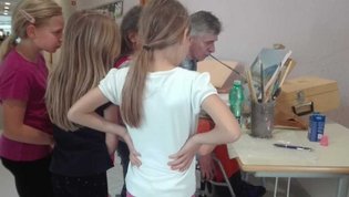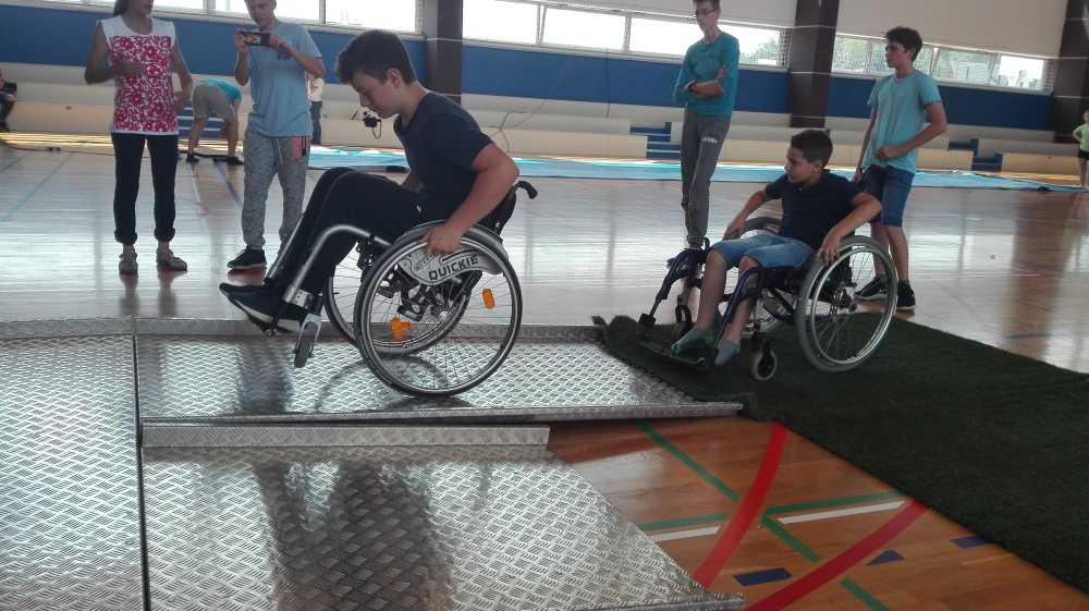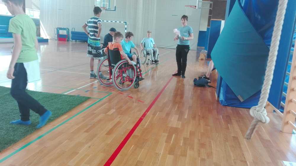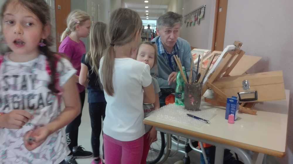 Prva je bila delavnica slikanja z usti, ki jo je demonstriral naš slikar Željko Vertelj, na drugi pa je bil postavljen poligon, kjer so učenci lahko praktično poizkusili srečanje z najbolj pogostimi arhitekturnimi ovirami s katerimi se invalidi ubadajo vsak dan.
