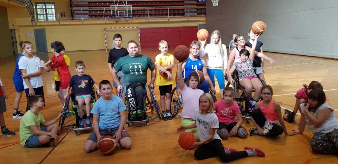 V športni dvorani so otroci spoznali športne panoge s katerimi se ukvarjamo paraplegiki in tetraplegiki. V telovdnici sta Boštjan in Jože demonstrirala košarko na vozičkih, ki je med nami zelo priljubljena, otroci pa so tudi poskusili iz vozička metati na koš.